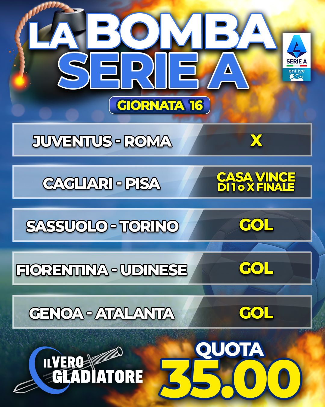Ecco la Mia Bomba Serie A per questa 16° Giornata di Campionato (2025/26), Quota 35.