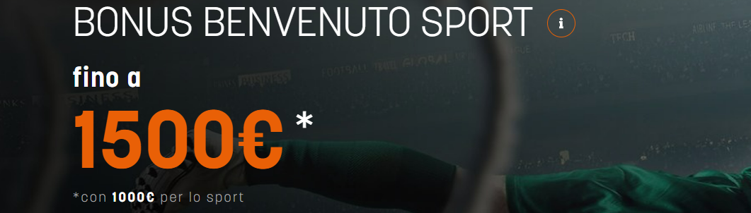 Questa offerta è composta da un bonus del 100% della prima ricarica fino a 1.000€ per lo sport + il 50% fino a 500€ per il casinò, per un massimale di 1.500€. Ma ci sono anche 5.000€ per la promo “Primo Giro” e 10€ di bonus registrazione SPID.