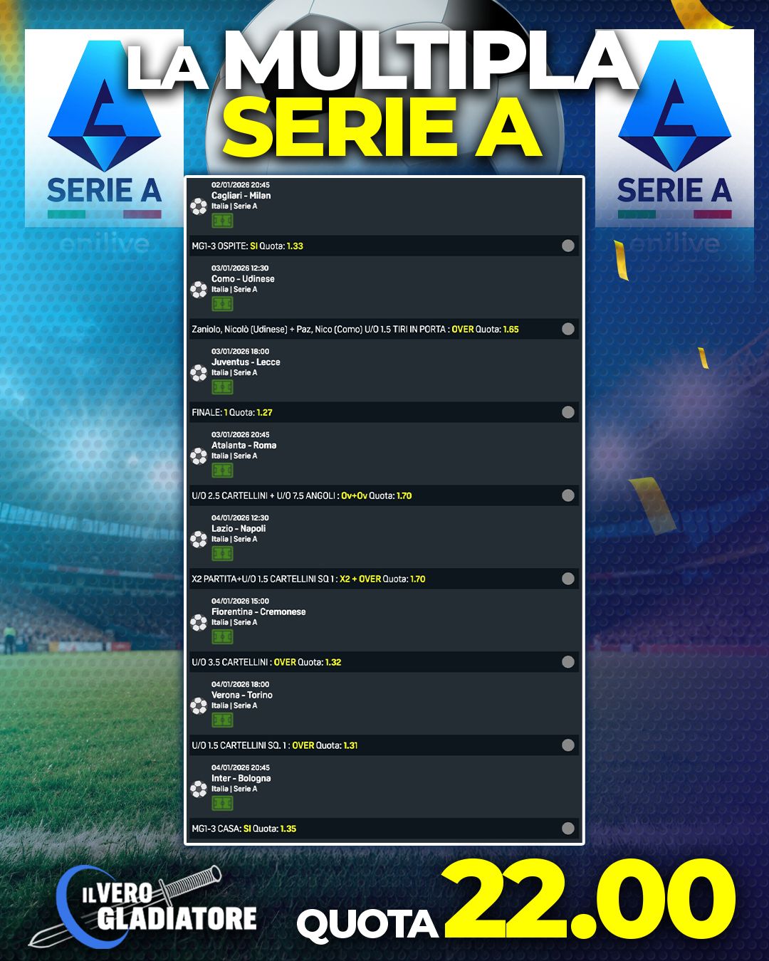Ecco la mia Multipla Serie A Quota 22 per questa 18° Giornata di Campionato 2026/2027