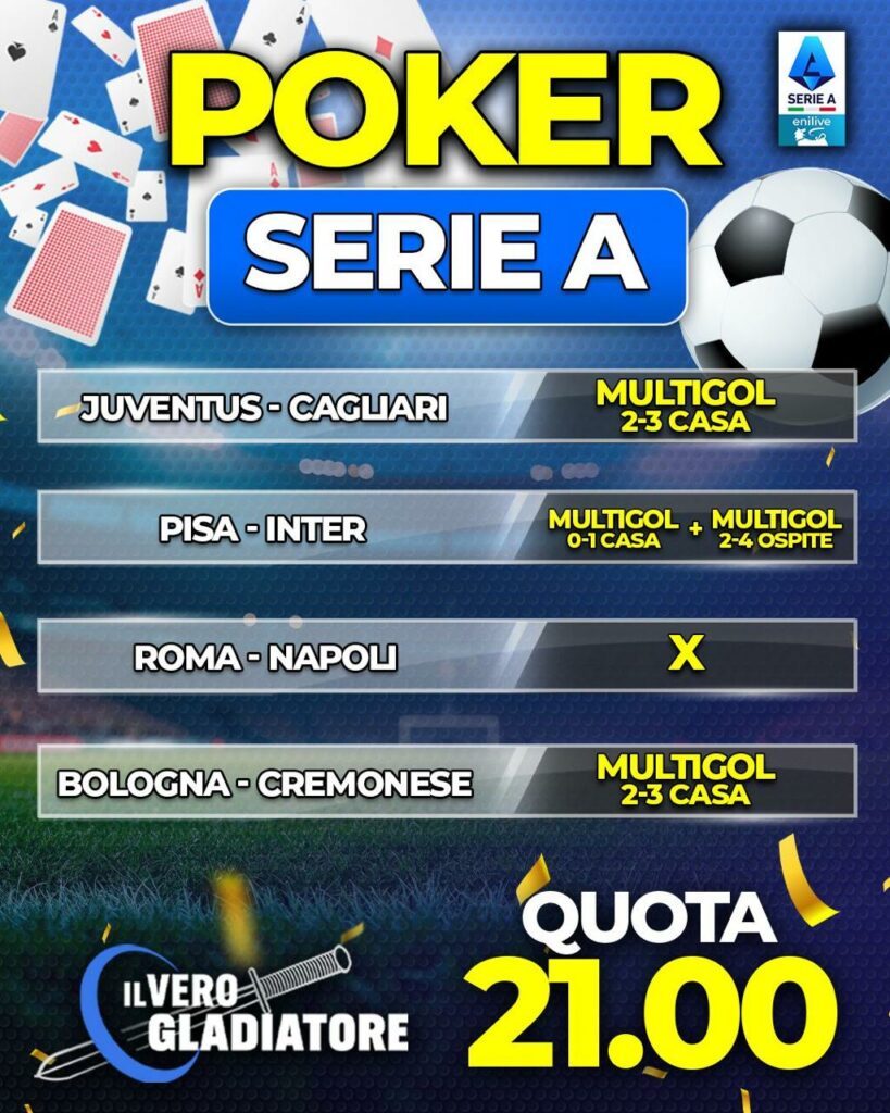 Ecco il Poker Serie A per questa 13° Giornata di Campionato (2024/25), Quota 21.